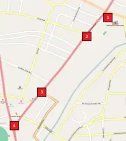 ![]() Map of the 2012 Pune attacks showing the principal targets numbered: (1) Balgandharva Auditorium, (2) Near Dena Bank, JM Road, (3) McDonald's restaurant, (4) near Garware Bridge.