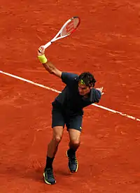 In the singles tournament, Federer first played Colombian Alejandro Falla, who took him to five sets at the 2010 Wimbledon Championships. Federer took the first set with ease, but lost a few match points and his serve late in the second set, allowing Falla to make a comeback and level the match at one set all. Federer regained control over the match, however, and closed out the third set to advance to the second round.[59] Federer then played Frenchman Julien Benneteau, who had also taken him to five sets at the 2012 Wimbledon Championships just over a month ago. Contrary to their previous matchup, Federer faced no challenge from Benneteau, and flew past him to a straight-sets win in less than an hour.[60] Federer next played Uzbek Denis Istomin in the third round, and clinched a tight first set after a short rain delay. He then took command in the second set and defeated Istomin.[61] In the quarterfinals, Federer faced American John Isner, and secured the first set after a break of Isner's serve allowed him to serve for the set. Federer then battled with Isner to reach a tiebreak in the second-set, which ended when a return of Isner's serve clipped the top of the net and dribbled over to win the match.[62] In the semifinals, Federer faced Juan Martín del Potro for the sixth time this season. He found himself in a one-set deficit after del Potro broke him in the middle of the first set and held to win the set. Federer, however, fought back in the second set, and after losing two opportunities to serve for the set, won the tiebreak with an ace on his second set point. Federer and del Potro then began a third set which saw del Potro creating a one-game lead and Federer matching it in his service games. Federer managed to break del Potro after twenty games, but was unable to convert the break, and del Potro broke back to continue the pattern. Eventually, Federer engineered another break at seventeen games all, and held serve to win the match on his second match point. The match, which stretched over four hours and twenty-six minutes, broke the record for the longest best-of-three-sets system match in the Open Era, surpassing the 4 hours and 3 minutes in Rafael Nadal’s victory over Novak Djokovic in the 2009 Madrid Masters.[63][64][65]