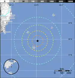 The 2012 Sanriku earthquake (三陸沖地震, Sanriku oki jishin) occurred near the city of Kamaishi, Japan, on December 7 at 17:18 JST.[9] The magnitude 7.3 shock generated a small tsunami, with waves up to 1 m high, that hit Ishinomaki in Miyagi Prefecture.[10] It occurred at a depth of 36 km within the Pacific Plate and was the result of reverse faulting, about 20 kilometres (12 mi) east of the Japan Trench.