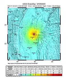 The 2012 Shwebo earthquake occurred at 07:42 local time (01:12 UTC) on 11 November in Myanmar. It had a magnitude of 6.8 on the moment magnitude scale and a maximum perceived intensity of VIII (Severe) on the Mercalli intensity scale.[2] The epicenter was near the town of Male, 52 km NNE of the city of Shwebo, 64 km west of Mogok and 120 km north of Mandalay. Significant damage and possible casualties have been reported from near the epicenter, with up to 26 people dead and many more injured. Part of a bridge under construction fell into the Irrawaddy River near Shwebo and a gold mine collapsed at Sintku.[3] [4] An aftershock with a magnitude of 5.8 followed at 17:24 local time (10:54 UTC).[5]