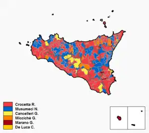 The election was competed by ten candidates from newly reshuffled political alliances, and is expected to be an unusually close race. The winner of the election was Rosario Crocetta,[2][3] candidate for a centre-left alliance of Democratic Party and the Union of the Centre.[3]
