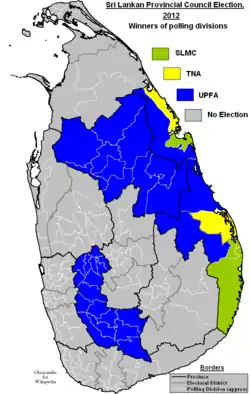 ![]() Winners of polling divisions. UPFA in blue, TNA in yellow and SLMC in green. | |||||||||||||||||||||||||||||||||||||||||||||||