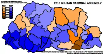 National Assembly elections were held in Bhutan on 31 May and 13 July 2013.[1] The result was a victory for the opposition People's Democratic Party (PDP), which won 32 of the 47 seats. The elections were the second general elections to occur in Bhutan since former King Jigme Singye Wangchuck ushered in democratic reforms.[2]