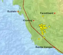 At 16:22 IRDT (11:52 UTC) on April 9, 2013, an earthquake with a magnitude of 6.3 struck the southwestern coast of Iran, in Bushehr Province.[2][3] It struck at a depth of 10 kilometres (6.2 mi), near the towns of Khvormuj and Kaki.[2] "Dozens" of aftershocks followed, most within the first hour of the main quake.[3][4] The strongest aftershock had a magnitude of 5.6.[5]
