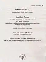 Miloš Zeman and Jan Fischer stated they would run if the election is direct.[47] 2008 presidential candidate Jan Švejnar was also speculated as a candidate.[48] Zeman's Party of Civic Rights started petition campaign for direct election on 29 June 2011.[49] Petition was signed by more than 100,000 people as of October 2011.[50] Direct election was accepted by parliament on 8 February 2012.[51]