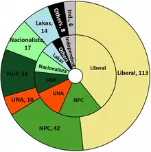 Speaker Feliciano Belmonte, Jr. is seen to keep his speakership position with the Liberals winning at least 100 out of the 234 district seats. Majority Leader Neptali Gonzales II said that a great majority of incumbents are poised to successfully defend their seats, and that the Liberal Party are to be the single largest party in the lower house. The Nacionalista Party has at least 15 winning representatives, "a substantial number" of the 40 incumbents Nationalist People's Coalition are to hold their seats, and the 34-member National Unity Party House leader Rodolfo Antonino expects Belmonte to be reelected as speaker. The United Nationalist Alliance won three seats in Metro Manila, and at least 2 more seats outside the metropolis.[11]