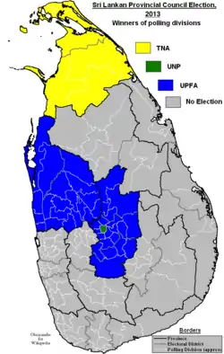 ![]() Winners of polling divisions. UPFA in blue, TNA in yellow and UNP in green. | |||||||||||||||||||||||||||||