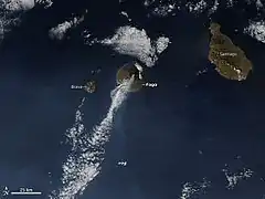 ![]() Satellite map of the eruption of Fogo with its volcanic clouds that headed south on 2 December 2014 | |