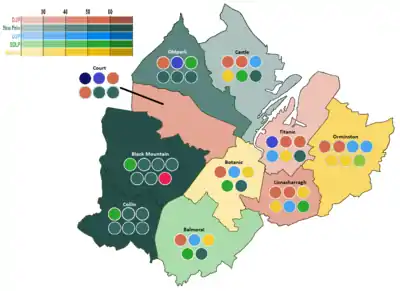 ![]() Belfast 2014 Council Election Results by DEA (Shaded by plurality of FPVs) | |||||||||||||||||||||||||||||||||||||||||||||||||||||||||||||||||||||