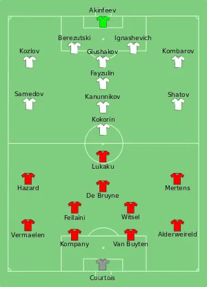 The two teams had met in eight previous matches (including matches involving the Soviet Union), including four in the FIFA World Cup (1970, group stage: Belgium 1–4 Soviet Union; 1982, second group stage: Belgium 0–1 Soviet Union; 1986, round of 16: Belgium 4–3 (aet) Soviet Union; 2002, group stage: Belgium 3–2 Russia).[8]