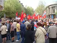 Over 100,000 attended a protest march from the Red Square to the State Historical Museum in Moscow, reviving a tradition last seen before the collapse of the Soviet Union in 1991.[5] The event was organized by the Federation of Independent Trade Unions of Russia.[15] Labour union organisers said that a total of 2 million people had attended similar rallies around the country.[6]