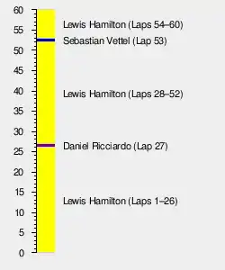 Hamilton led Vettel by 24 seconds by the next lap and wanted to make a pit stop because he was worried about tyre wear but was advised to further grow his advantage over the next three laps.[37] Hamilton made his final pit stop for the soft compound tyres on lap 52. He rejoined in second behind Vettel and narrowly ahead of Ricciardo.[41] Hamilton quickly caught Vettel, used DRS leaving turn five, and turned right to reclaim the lead two corners later on lap 54.[37] Button stopped at the side of the track to retire with a power box failure on the same lap.[45] His retirement promoted Räikkönen to seventh and Bottas' worn tyres slowed him, enabling Hülkenberg, Vergne and Pérez to run close behind him.[37][42] Maldonado's aspiration for his first point of 2014 was not realised when Magnussen passed him for tenth place on lap 56. Three laps later, Vergne passed Hülkenberg for eighth place.[41] Vergne overtook Räikkönen for seventh on the left into the first corner and then Bottas for sixth. Pérez had better traction than teammate Hülkenberg and passed him between turns 17 and 18.[37]