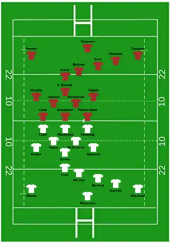 The teams were both drawn in Pool A and ran riot over their opposition Spain and Samoa. Canada played their first game against Spain on 1 August and a hat-trick from Magali Harvey gave the Canadians a 31–7 victory.[3] England played only their second ever game against Samoa later the same day. They started slow and early in the match, scrum half Natasha Hunt was overturned onto her head by Samoan fullback Soteria Pulumu, which resulted in Pulumu being sent off, the first red card in a Women's World Cup.[4] Emily Scarratt then gave England first points before Katherine Merchant scored their famous first try. Merchant would then become one of four players to score twice along with the recovered Hunt, and wingers Lydia Thompson and Kay Wilson to give the former champions a 65–3 win.[5][6] Four days later on 5 August, Canada and England defeated Samoa and Spain 42–7 and 45–5 respectively, playing in a similar fashion, both teams scoring five tries from five different scorers.[7]