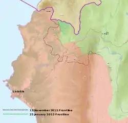 The following day, the military expanded its control from Salma, capturing Mrouniyah and Marj Khawkha.[118] By 15 January, they took control of another six villages as rebel defenses collapsed.[119][120][121]