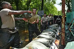 ![]() Louisiana National Guards members with the 844th Engineer Company, 527th Engineer Battalion, construct a sandbag barrier wall around Dupree #23 Pump Station in Pineville, La | |