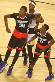 At the time of the roster announcement the 24 players included 22 of the top 25 players according to the 2015 ESPN 100.[4] The two highest rated players (Ben Simmons and Jaylen Brown) were both named to the East team.[4][5] The West team roster was highlighted by Malik Newman.[3] Based on ratings at ESPN.com, the highest rated eligible player not invited was number 18 ranked Texas A&M signee Tyler Davis.[4] However, according to 247Sports.com's composite ranking, the highest rated non-invitee was 15th-ranked Arizona signee Ray Smith.[5] Nine uncommitted players at the time of the roster announcement was regarded as a high total and was higher than the total of two the year before.[4][5] Kentucky signee Skal Labissière (number 3 at ESPN and number 5 at 247Sports.com) was not eligible due to his athletic ineligibility after transferring.[4][5] As of gametime, 8 players remained undecided on their college affiliations.[6] 5 of the players were scheduled to begin play in the Dick's Sporting Goods High School Nationals the following day.[7]