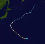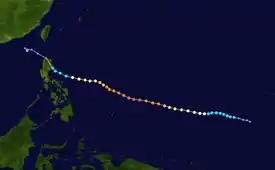 On May 3, a tropical disturbance south southeast of Pohnpei began to organize, and the JMA upgraded the disturbance into a tropical depression.[96] Late on May 6, the JTWC started issuing advisories and designated it as 07W.[97] On May 9, the JMA upgraded the depression into a tropical storm and named it Dolphin.[98] The JMA further upgraded Dolphin to a severe tropical storm on May 12,[99] and on the following day, the JTWC upgraded Dolphin to a typhoon.[100] Six hours later, the JMA had followed suit.[101] Over the next few days, Dolphin continued to intensify until it reached Category 5 super typhoon status on May 16. It weakened into a category 4 super typhoon 12 hours later, until it weakened into a category 4 equivalent typhoon after maintaining super typhoon status for 30 hours. Dolphin weakened further into a severe tropical storm on May 19, as the JTWC downgraded Dolphin into a tropical storm and issued their final warning. On May 20, the JMA issued their final warning, and the JTWC and the JMA declared that Dolphin had become an extratropical cyclone.[102][103]
