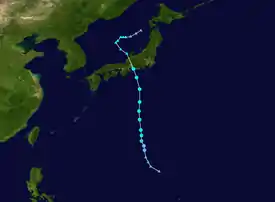 By March 29, the JTWC started to monitor a tropical disturbance over the Marshall Islands, and later upgraded it to a "low chance" of being a cyclone two days later.[77] Best track indicated that the system developed into a tropical depression during April 2,[78] but operationally the JMA did so on April 3.[79] Shortly thereafter, the JTWC designated the system to 05W, when 1-minute winds stated that it had strengthened into a tropical depression.[80] 05W started to organize with a slight consolidation of its LLCC and some convective banding; the JTWC upgraded 05W to a tropical storm.[81] The JMA did the same later, when it was given the name Haishen.[82] Haishen remained at low-level tropical storm strength until its center became fully exposed with its deepest convection deteriorating due to wind shear.[83] Both the JMA and JTWC stopped monitoring the system during April 6, as it dissipated over open waters to the southeast of the Mariana Islands.[78]