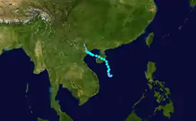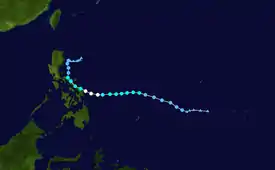 Tropical Storm Bavi was first noted as a tropical disturbance during March 8, while it was located 500 km (310 mi) to the southeast of Kwajalein Atoll in the Marshall Islands.[56] Over the next few days the system moved north-westwards through the Marshall Islands, and was classified as a tropical depression during March 10.[57] The system continued to develop over the next day as it moved north-westwards, before it was classified as a tropical storm and named Bavi by the JMA.[57] The system subsequently continued to gradually intensify as it moved westwards, around the southern periphery of the subtropical ridge of high pressure located to the northwest of the system.[57][58] During March 14, the system peaked as a tropical storm with the JMA reporting 10-minute sustained winds of 85 km/h (55 mph), while the JTWC reported 1-minute sustained winds of 95 km/h (60 mph).[57][59] As the system subsequently started to weaken the system's low level circulation passed over Guam during March 15, while convection associated with the system passed over the Northern Mariana islands.[15][60] Over the next couple of days the system moved westwards and continued to weaken, before it weakened into a tropical depression during March 17, as it moved into the Philippine area of responsibility, where it was named Betty by PAGASA.[57][61] The JTWC stopped monitoring Bavi during March 19, after the system had weakened into a tropical disturbance, however, the JMA continued to monitor the system as a tropical depression, until it dissipated during March 21.[57][59]