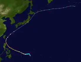 A day after Bavi dissipated, a low-pressure area formed southwest of the Marshall Islands. It slowly drifted northwestward and became more organized over the next two days.[65] The next day, the JMA started tracking the system as a tropical depression.[66] On March 27, the JTWC started tracking the system as a tropical depression, and designated it 04W.[67] Moving west-northwestward, the system's center became more consolidated with convective banding becoming wrapped into it. The JTWC upgraded 04W to a tropical storm the same day.[68] The JMA followed suit later that day, when it was named Maysak.[69] On March 28, Maysak developed an eye,[70] and the JMA further upgraded it to a severe tropical storm.[71] The eye became more well defined with deep convection persisting along the southern quadrant of the storm. The overcast became more consolidated,[72] as the JMA upgraded Maysak to a typhoon on the same day.[73] On March 29, Maysak rapidly intensified over a period of 6 hours, attaining 1-min maximum sustained winds of 230 km/h (145 mph), making it a Category 4 equivalent on the SSHWS.[74] On the next day, Maysak further intensified into a Category 5-equivalent super typhoon. On April 1, the PAGASA stated tracking on the system, naming it as Chedeng. Typhoon Chedeng (Maysak) weakened more and eventually dissipated in the Luzon landmass. The remnants of Maysak eventually made it to the South China Sea.[75]