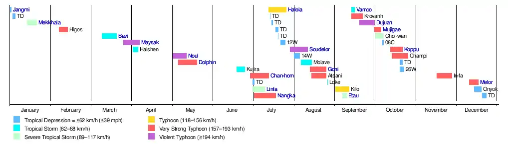 In May, two storms, Typhoons Noul and Dolphin, both reached Category 5 super typhoon intensity.[19] Both typhoons affected landmasses and altogether caused about $37.1 million in damages, respectively. Kujira formed in June and made landfall in southeast Asia, bringing flooding.[20] During the first week of July, the tropics rapidly became active, with a trio typhoons developing simultaneously and affecting three different landmasses. Total damages from Chan-hom, Linfa and Nangka nearly reached US$2 billion. Afterwards, Typhoon Halola entered the basin from the Eastern Pacific.[21] In August, Typhoon Soudelor made landfall in Taiwan and China, where it killed 38 people and damages totaled up to US$3.7 billion. Typhoon Goni badly affected the Philippines, the Ryukyu Islands and Kyushu as an intense typhoon, causing about US$293 million in damages.[22]