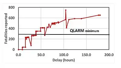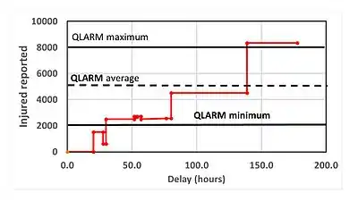 The number of fatalities was estimated as several hundred within thirty minutes of the earthquake.[30] However, the media reported the number of fatalities as significantly lower than what actually happened and than what was estimated within thirty minutes as the figure of reported fatalities with time shows. The number of injuries reported by media also remained below the ultimate count and below the correct estimate within 30 minutes by QLARM as seen in the next figure.