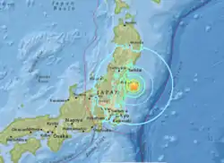 The earthquake measured magnitude 6.9. It struck off mainland Japan 35 km (22 mi) east-southeast of Namie, Fukushima Prefecture at 05:59 JST on November 22, 2016 (20:59 Nov 21 UTC), at a depth of 9.0 km ± 1.7.[4][5] The earthquake was initially reported as having a magnitude of 7.3 by the Japan Meteorological Agency, who later upgraded the magnitude to 7.4, while the United States Geological Survey and GFZ Potsdam reported it as having a magnitude of 6.9 Mwb .[6]