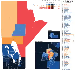 The 2016 Manitoba general election was held on April 19, 2016 to elect members to the Legislative Assembly of Manitoba, Canada.[1] The New Democratic Party of Manitoba, led by Greg Selinger, were defeated by the Progressive Conservative Party of Manitoba led by Brian Pallister, ending nearly 17 years of NDP government. The Tories won 40 seats, one of the largest majority governments in Manitoba history, the other one was in 1915 when Liberals also won 40 seats.[2]