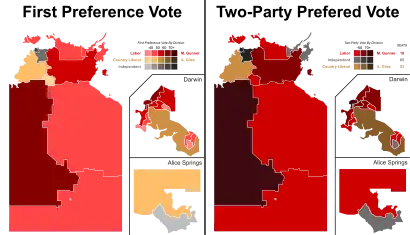 Additionally, Giles lost his Alice Springs-based seat of Braitling to Labor, making him only the second Chief Minister/Majority Leader to lose his own seat at an election. Labor also took Katherine, previously the safest seat in the Territory, off the CLP. It was the first election that saw Labor win seats in Katherine and inner Alice Springs.[4]