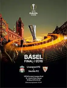 The 2016 UEFA Europa League Final was a football match between Liverpool of England and Sevilla of Spain on 18 May 2016 at St. Jakob-Park in Basel, Switzerland. The showpiece event was the final match of the 2015–16 UEFA Europa League, the 45th season of Europe's secondary club football tournament organised by UEFA.[5] Liverpool were appearing in their fourth final, after their appearances in 1973, 1976 and 2001, all of which they won. Sevilla were appearing in their fifth final and third in succession. They had appeared in 2006 and 2007, as well as the previous two finals in 2014 and 2015, winning all four.