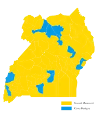 Presidential election results map. Yellow denotes provinces won by Museveni, and Blue denotes those won by Besigye.