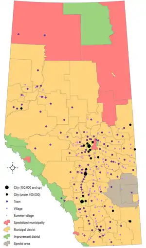 ![]() Alberta's 344 municipalities (19 cities, 106 towns, 80 villages, 51 summer villages, 6 specialized municipalities, 63 municipal districts, 7 improvement districts, and 3 special areas) as of July 2021 | ||