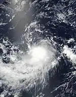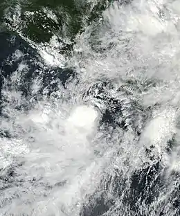 On July 28, the NHC noted the possibility of an area of low pressure well south of Mexico developing over subsequent days.[88] An area of disorganized showers and thunderstorms associated with a tropical wave materialized three days later, but little change occurred thereafter.[89] Early on August 3, a surface circulation formed in association with concentrating convection,[90] and this process led to the formation of a tropical depression by 06:00 UTC the next day.[91] The newly formed cyclone did not intensify after designation, and its low- and mid-level circulations separated by over 265 mi (425 km) on August 5 due strong easterly wind shear.[92] Falling short of the tropical storm criteria, the short-lived depression was declared a remnant low at 18:00 UTC that day.[91] The lingering vortex slowed its northwestward motion and executed a counter-clockwise loop, before dissipating completely 205 miles (335 km) southwest of the Baja California Peninsula on August 8.[91]