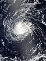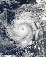 Hurricane Eugene developed from a disturbance located 765 mi (1,230 km) south of the southern tip of the Baja California Peninsula on July 7.[30] On the following day, Eugene underwent a period of rapid intensification; in an 18-hour period starting at 21:00 UTC on July 8, Eugene intensified from a tropical storm with 70 mph (115 km/h) winds to a Category 3 hurricane with 115 mph (185 km/h) winds, making it the first major hurricane of the season.[31][32] However, by 12 hours later, the entrainment of dry air caused Eugene to weaken to a Category 2 hurricane,[33] and due to traveling over cooler waters, Eugene weakened to a tropical storm on the following day.[34] As the coverage of deep convection steadily dwindled, Eugene fell to tropical depression intensity around 15:00 UTC on July 12, and degenerated to a remnant low six hours later.[35][36]