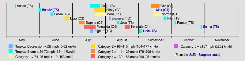 Although hurricane season in the eastern Pacific does not officially begin until May 15, and on June 1 in the central Pacific,[6] activity began several days prior with the formation of a tropical depression on May 9. This was the earliest formation of a tropical cyclone on record,[7] a record that stood until broken by Tropical Depression One-E in 2020. When it intensified into Tropical Storm Adrian a few hours later, the system became the earliest named storm on record in the basin,[8] a record that stood until broken by Tropical Storm Andres in 2021.[9] Near normal activity occurred in June, with Tropical Storm Calvin formed on June 11, and Hurricane Dora on June 25.[10] For the third year in a row, July featured above average activity, with the fifth highest ACE value for that month on record.[11] This total was due to long-lived hurricanes Eugene, Fernanda, Hilary, and Irwin. August saw significantly less activity, with only three storms forming in the month; however it featured Hurricane Kenneth, the third major hurricane of the season. September featured four storms, including Hurricane Otis, which became the fourth major hurricane of the season. Only two storms formed after October 1, Ramon and Selma. Both did not attain hurricane status, though Selma became the first and last storm to make landfall in El Salvador. No systems were active in November for the first time since the 2010 season.