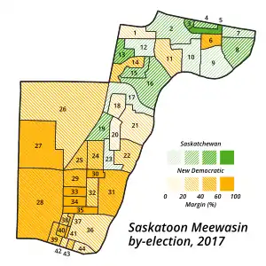 The 2017 Saskatoon Meewasin provincial by-election was a held on March 2, 2017. The vote was called after the death of incumbent MLA Roger Parent of the Saskatchewan Party, who died of cancer on November 29, 2016.[1]