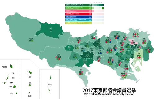 Prefectural elections for the Tokyo Metropolitan Assembly (平成29年/2017年東京都議会議員選挙, Heisei 29-nen/2017-nen Tōkyō togikai giin senkyo, "Heisei 29/2017 election of members of the Tokyo Metropolitan Assembly") were held on 2 July 2017. The 127 members were elected in forty-two electoral districts, seven returning single members elected by first-past-the-post, and thirty-five returning multiple members under single non-transferable vote. Four districts had their magnitude adjusted in this election to match population changes.