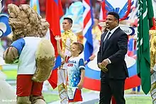 Zabivaka™ (English: "The one who scores"), was the official mascot for the 2018 FIFA World Cup and was voted for by a 53% margin. The design is of a wolf who represents fun, charm, and character.[4] Former world cup winning, Brazilian striker Ronaldo was another mascot of the tournament. Ronaldo was the intended man to deliver the ceremonial first kick of the tournament but instead, he gave that honor to the child mascot who passed the official match ball to Zabivaka™ in order to start the tournament. The match ball (an Adidas Telstar 18) was sent into space with the International Space Station crew in March and came back to Earth in early June.[5]