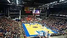 The Žalgiris Arena is a multi-purpose indoor arena in the New Town of Kaunas, Lithuania. The arena is located on an island of the Nemunas River. It is the largest indoor arena in the Baltics. The arena's maximum possible seating capacity for basketball games is 15,552, and 20,000 spectators for concerts (when the stage is in the middle, and 17,000 when stage is in the side of the arena). The Žalgiris Arena replaced the Kaunas Sports Hall as a major venue in the city.