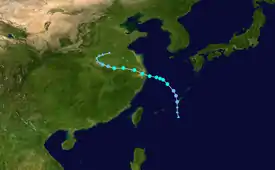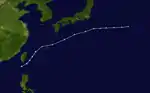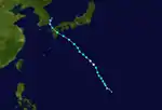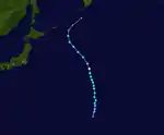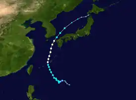 A disturbance formed southwest of Taiwan on June 12 just within the meiyu front, and the JTWC subsequently indicated the formation of a subtropical depression.[50] At 21:00 UTC on June 13, the JTWC issued its first advisory on the system and designated it as 07W, classifying it as a tropical depression.[51] Despite being affected by moderate to severe wind shear, the system was located over relatively warm sea-surface temperatures as it produced patches of convection, and this prompted the JTWC to upgrade 07W to a tropical storm.[52] The JTWC later issued their fourth but final advisory on 07W at 15:00 UTC on June 14 when the system was rapidly undergoing a phase of extratropical transition and as the system was rapidly losing its structure.[53] 07W fully became an extratropical cyclone just to the south of mainland Japan at 06:00 UTC on June 15, although its remnant was still tracked until June 25, when the system was last located near the coast of British Columbia.[50]