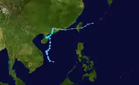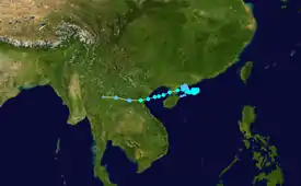 A low-pressure area developed into a tropical depression over the South China Sea on June 2.[34][35] Later that day, the JTWC followed suit and assigned the designation 05W to the system.[36] 05W meandered in a westward direction until it curved northward, and after three days, the JTWC upgraded the system to a tropical storm.[37] The JMA did the same three hours later early on June 6, naming it Ewiniar.[38] Shortly thereafter, Ewiniar made landfall over South China. Ewiniar maintained its intensity while over land until the JTWC issued its final advisory late on June 7.[39] The JMA, however, tracked the system until early on June 9, when Ewiniar had weakened into a tropical depression and degenerated into a remnant low.[40] However, Ewiniar's remnants moved out to sea and continued to persist, before dissipating on June 13.