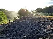 Fire first broke out on Saddleworth Moor, between Sheffield and Manchester, on 24 June 2018, but that fire was extinguished later that same day. But the next day, pockets of the fire re-ignited, perhaps from burning of peat which had dried out deep; this began to burn out of control from 26 June, and a major incident was declared that day. By 27 June, the moorland fire had grown to cover over 2,000 acres (810 ha) and remained uncontained.[17] Rapidly changing wind speed and direction helped the fire to spread quickly across the dry moorland and complicated efforts to fight the fire, which split into several fronts moving in different directions.[17] Dry peat is also making fighting the fire difficult, as the fire can continue to smoulder underground after being extinguished at the surface, re-igniting the surface later.[18]