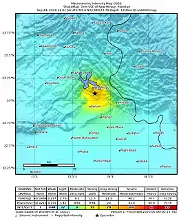 The 2019 Kashmir earthquake struck regions of Pakistan with an epicentre in Azad Kashmir[2] on 24 September at 16:02 local time (11:02 UTC). It had a magnitude of 5.6 Mw and a maximum felt intensity of VII (very strong) on the Modified Mercalli scale.[1] There was severe damage in Mirpur District, causing the deaths of 40 people and injuring a further 850.[3] The epicentre of the shallow quake was near the city of Mirpur, Pakistan.[4] The tremors were felt in the Kashmir region, Punjab (Pakistan), Punjab (India), Uttarakhand and northern parts of India including New Delhi.[5]