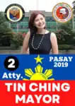 Mayor Antonino Calixto was on third and final term and is barred for seeking another term. He ran for Congressional seat in the lone district. Her sister, Congresswoman Imelda Calixto-Rubiano, ran for his place.[1] Her opponent is Cesar Joseph "Chet" Cuneta, son of former Mayor Pablo Cuneta and older brother of actress and singer Sharon Cuneta.[2] Other opponents were Fiscal Edward "ET" Togonon, who served as Chief Prosecutor of Pasay, Muntinlupa and Manila for 32 years,[3] Atty. Cherry Christine “Tin” Ching, and Jon Wilfred “JT” Trinidad, Former SK Federation President and son of the late former Mayor Atty. Wenceslao "Peewee" Trinidad.