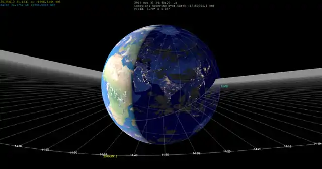 2019 UN13 is a small near-Earth asteroid roughly 1–2 meters in diameter. Even though the asteroid was in the night sky for months, it was fainter than the sky survey limit of apparent magnitude 24 until 29 October 2019 when the asteroid was two million km from Earth.[7] It was discovered on October 31, 2019, passing 6,200 km above Earth's surface.[8][9]