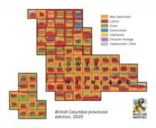 The 2020 British Columbia general election was held on October 24, 2020, to elect members of the Legislative Assembly to serve in the 42nd parliament of the Canadian province of British Columbia. The incumbent New Democratic Party of British Columbia (BC NDP) won a majority government, making John Horgan the first leader in the history of the BC NDP to win a second consecutive term as Premier.[2] The incoming Legislature marks the first time the NDP commanded an outright majority government in BC since the 1996 election, as well as the first province-wide popular vote win for the party since 1991.