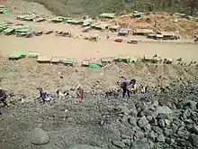 Alongside the larger mining companies, independent "jade pickers" or freelance miners scavenge tailings from the larger operators.[4] These freelance miners live in ramshackle quarters at the base of large mounds of rubble excavated by heavy machinery.[9] Mining is performed at the Wai Khar jade mine site by hundreds of people who scavenge through tailings dumped by trucks at the site. The tailings form large slopes, described by BBC News as a "an area denuded of trees and resembling a moonscape", which is susceptible to collapse.[5] An estimate 400,000 people work as freelance miners in northern Myanmar, and as of 2018 Myanmar was ranked first among all countries in landslide fatalities.[3]