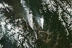 As of August 16, over 1,500 fires have been recorded according to the BC Wildfire Service.[4] The Sparks Lake Fire was the largest fire burning in the province, having burned an estimated 95,980 hectares (237,172 acres) of the Bonaparte Plateau northwest of the city of Kamloops.[5][6][7][8]