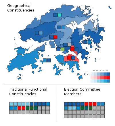 The 2021 Hong Kong Legislative Council election was a general election held on 19 December 2021 for the 7th Legislative Council of Hong Kong.[2] Under the drastic Beijing-imposed electoral overhaul, the total number of seats was increased from 70 to 90 seats, with the directly elected geographical constituencies (GCs) reduced from 35 to 20 seats, the trade-based indirectly elected functional constituencies (FCs) staying at 30, and the additional 40 seats being elected by the 1,500-member Election Committee.[3][4][5]