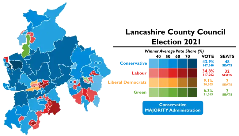 ![]() Map showing the results of the 2021 Lancashire County Council election. | ||||||||||||||||||||||||||||||||||||||||||||||||||||||||||||||